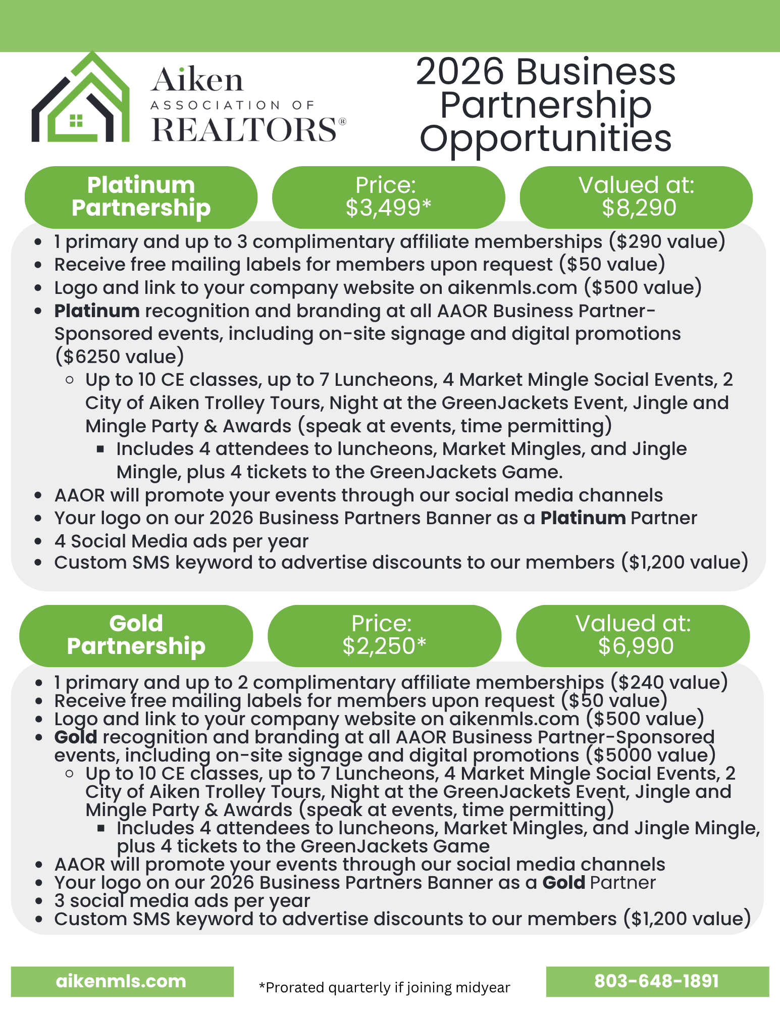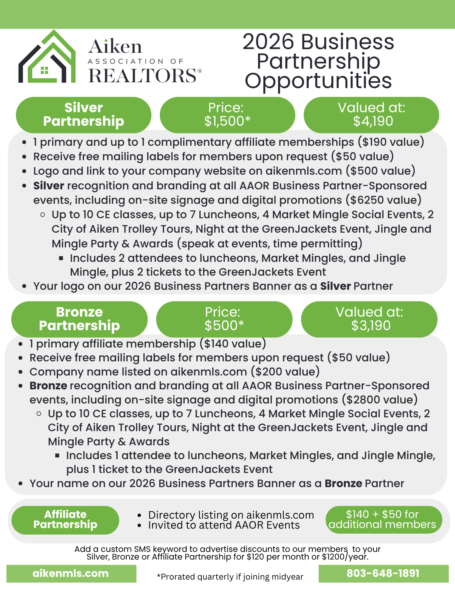 The Aiken Association of REALTORS® (AAOR) is launching its Business Partnership Program in 2026*, providing Affiliate Members with an opportunity to enhance their visibility and showcase their expertise as trusted partners in the real estate community. The application deadline for inclusion on the Business Partner Banner is January 31, 2026.