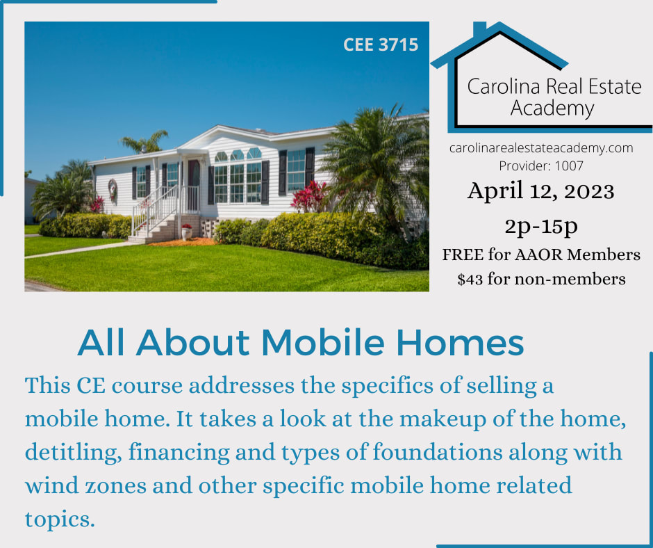 This CE course addresses the specifics of selling a mobile home. It takes a look at the makeup of the home, detitling, financing and types of foundations along with wind zones and other specific mobile home related topics. 3 hours elective creditImages
