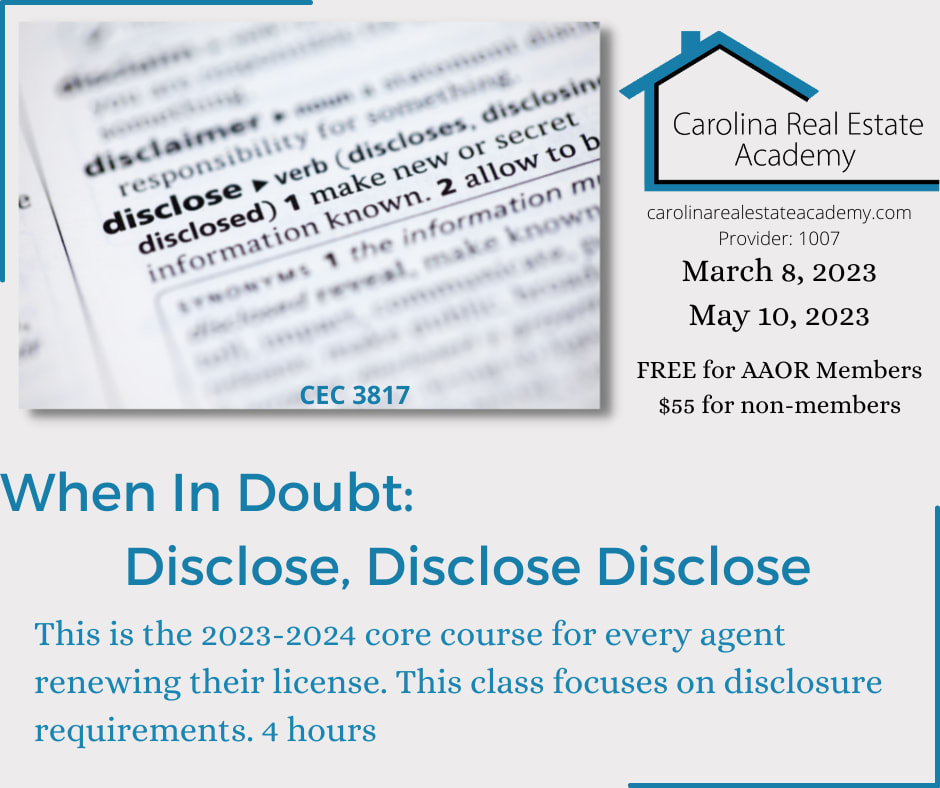 This is the mandatory course that, with minor exceptions, is required prior to 2023 or 2024 renewals. It focuses on disclosure requirements for real estate licensees, whether relating to property or transaction issues, personal interest, disclosure of fees from more than one party, disclosures to multiple buyer clients, etc. The attendee will also review SC Code of Laws 27-50, the Residential Property Condition Disclosure Act, to identify the role licensees have under this law.Images